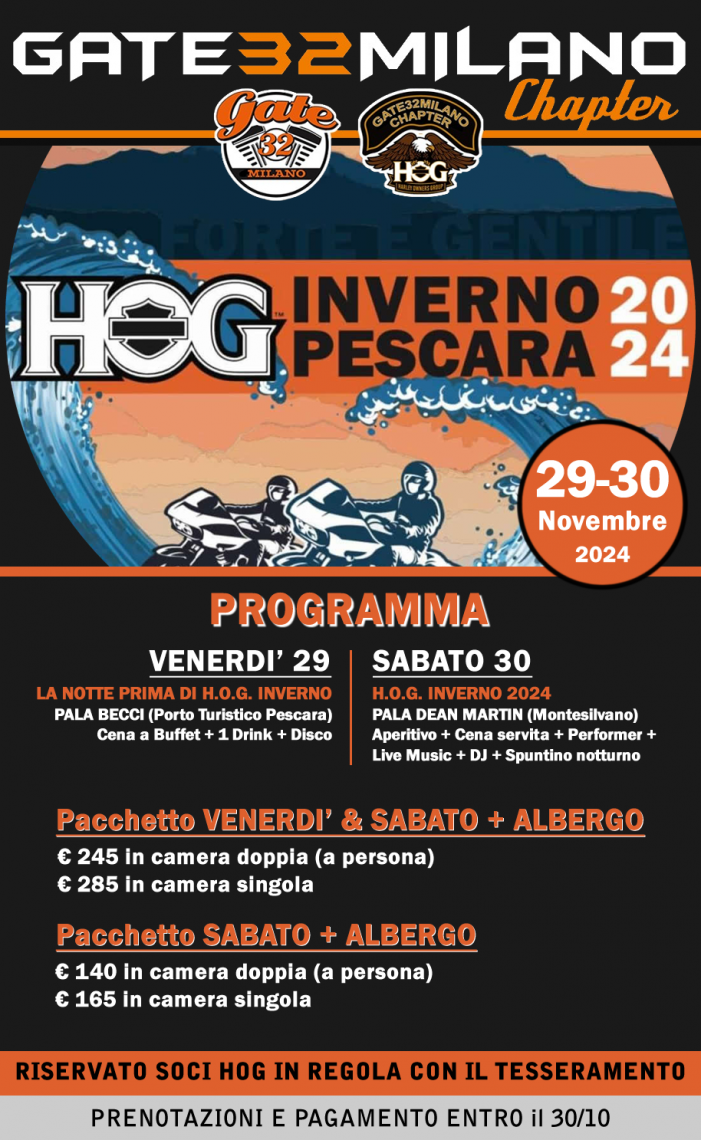 30 Novembre 2024 Sono aperte le iscrizioni al BARCOLLO MA NON MOLLO 2024 Per chi poi parteciperà anche all’HOG INVERNO a Pescara ci sarà una partenza organizzata. Referente dell’evento il nostro Head Road Captain Filippo Besana.